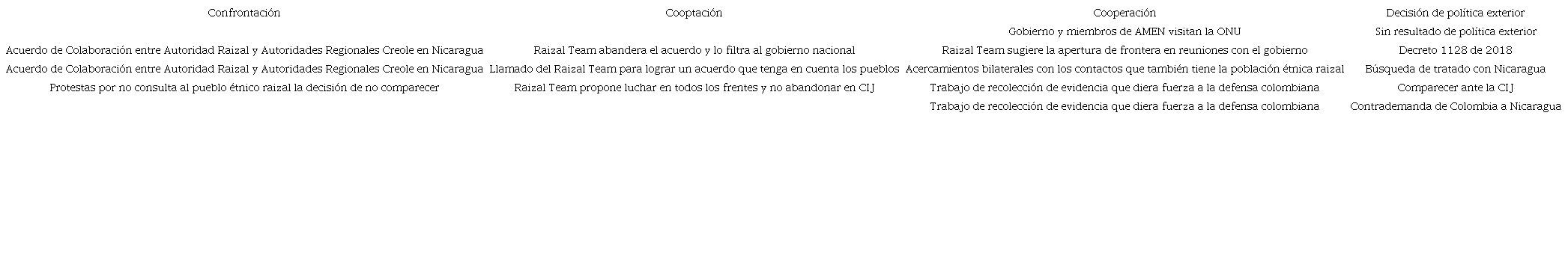 Así, pues, se señala que el grupo étnico raizal participó en la política exterior colombiana en el período 2012-2017, motivado por los cambios producidos en el diferendo limítrofe entre Colombia y Nicaragua definido por la CIJ. Esta participación se produjo en el marco de una relación estratégica con el Estado colombiano que se dio a través de la confrontación de los raizales hacia el Estado, la cooptación del Estado a los raizales y la cooperación entre ambas partes. De esta relación estratégica es posible identificar acciones de política exterior de Colombia en el período indicado.