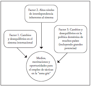 Muchas de las herramientas que se emplean en la "zona gris" no son nuevas, pues fueron, y se vienen utilizando desde la guerra fría por parte de diferentes Estados. Sin embargo, los atributos señalados en alguna medida se han visto ampliados y potenciados en las últimas décadas gracias a un contexto internacional, regional y local, altamente permisivo, configurado a partir de una serie de catalizadores o factores: