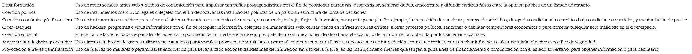 Sin embargo, en algunos casos, quienes emplean estas herramientas juegan intencionalmente con el riesgo de que se produzcan acciones militares violentas, a fin de crear las condiciones para un escalamiento que desincentive medidas disuasivas por parte del adversario (Rand, 2019, p. 11).