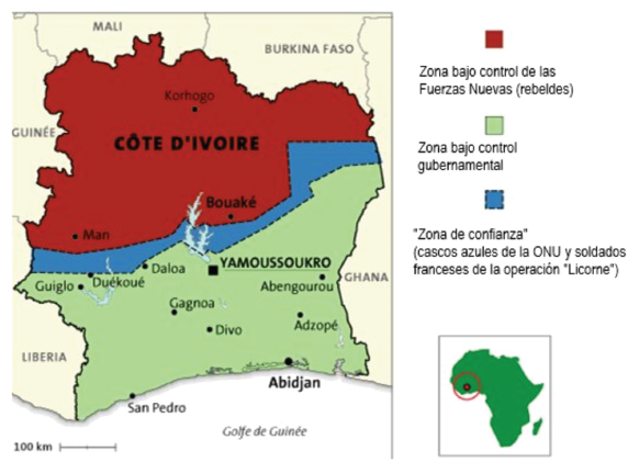 Durante prácticamente una década, Costa de Marfil, escindido en dos partes, era una especie de Estado dentro del Estado, donde el sur estaba bajo control del régimen en turno encabezado por el presidente Laurent Gbagbo, mientras el norte se encontraba bajo el control del movimiento social insurreccional encabezado por su líder Guillaume Soro. Entre dichas fuerzas beligerantes, se interpusieron dos principales fuerzas externas por medio de una zona de confianza: los cascos azules de la ONU y los soldados franceses de la operación Licorne4.