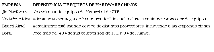 Hasta octubre de 2020, de las principales empresas de telecomunicaciones de India, solo Jio Platforms no usaba equipos de Huawei ni de ZTE. Mientras que Vodafone Idea y Bharti Airtel tienen una estrategia de tipo "multivendor", que incluye proveedores chinos, paradójicamente la estatal BSNL cuenta con 40% de equipos de ZTE y 9% de Huawei (Quartz, 2020).