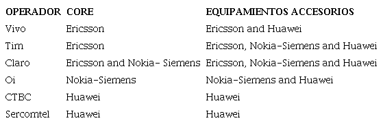 En la tabla que sigue se presentan los principales operadores brasileños, con sus respectivos proveedores de equipos centrales y de equipamientos accesorios. Como se puede observar, Huawei, Ericsson y Nokia son usados por la mayoría de las operadoras y, por lo tanto, disputan mercados.