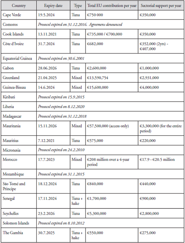 The tuna agreements, concluded by several SIDS, allow EU vessels to 'fish for different species of large tunas that migrate along from the coasts of Africa and cross the Indian Ocean', whereas the 'multi-species agreements offer fishing opportunities for demersal and pelagic species, tuna, cephalopods and shrimp'. There are also seven so-called 'dormant agreements' with Equatorial Guinea, Kiribati, Liberia, Madagascar, Micronesia, Mozambique and the Solomon Islands. The latter 'stand for countries that have a fisheries partnership agreement which is still in force but there is no implementing protocol in force', the consequence being that EU vessels are 'not al-lowed to fish in waters under the regime of the dormant agreements' (European Commission, 25 June 2022).