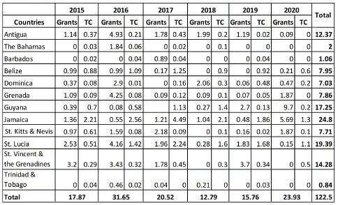 In 2020, Japan's ODA to Caricom states was approximately US$23.93 million in grant aid and technical cooperation, an increase from US$15.76 million in 2019 (see Table 1). From 2017-2019, grants amounting to US$435 million were given to projects for the rehabilitation of fishery buildings in Dominica, and the reconstruction of bridges in Cul-De-Sac Basin in St. Lucia. Also, for the introduction of renewable energy and the improvement of the power system in Guyana and the improvement of the emergency communication system in Jamaica. In 2017, Jamaica received an ODA loan of approximately US$15 million for an "Energy Management and Efficiency" program.