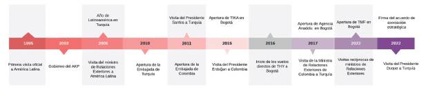 Las relaciones o, en otras palabras, la profundización del vínculo Turquía y Colombia ha progresado paralelamente conforme al acercamiento del país con la región latinoamericana que es el otro resultado del cambio de la política exterior del país. Sin embargo, el verdadero inicio de las relaciones se remonta a finales del siglo XIX. Estas primeras interacciones entre ambos países se produjeron en el marco de unas relaciones diplomáticas limitadas y comenzaron con la población que emigraba a Colombia con "pasaportes" otomanos desde los territorios del Imperio Otomano (especialmente las actuales Siria, Líbano y Palestina). Durante este periodo se pueden rastrear algunas correspondencias diplomáticas entre los dos países por parte de ciudadanos y, de esta forma, se forjaron las primeras interacciones entre los dos países (Türkiye-Di§i§leri Bakanligi Arsivleri, 2023) (trabajo de archivo y traducción de los autores).