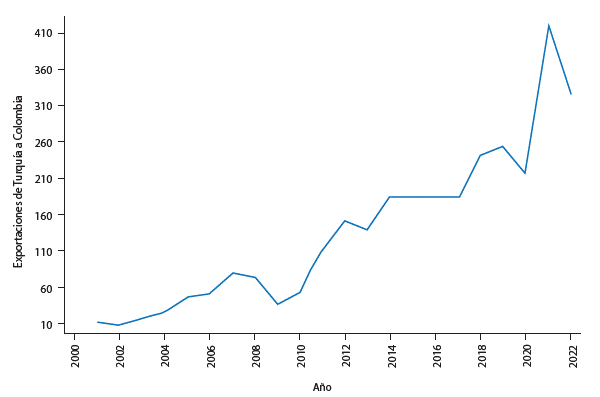 En la medida en que los efectos de la crisis económica de 2008 se superaron rápidamente, las exportaciones de Turquía a Colombia se recuperaron a partir de 2010. En efecto, las exportaciones que llegaron a los 36 millones de dólares en 2009 aumentaron a 52 en 2010 y casi que se duplicaron a 110 millones en 2011. Posteriormente, las exportaciones siguieron aumentando hasta la pandemia de covid-19 de 2020. Las exportaciones, que aumentaron hasta 255 millones de dólares en 2019, disminuyeron hasta 216 millones de dólares en 2020 como consecuencia de la pandemia. Sin embargo, el impacto se superó rápidamente y las exportaciones aumentaron a 420 millones de dólares en 2021. Esta cantidad fue la más alta de las exportaciones de Turquía a Colombia, con un aumento del 94% en comparación con el año anterior. Sin embargo, volvió a contraerse en 2022 a aproximadamente 320 millones de dólares.