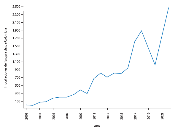 Las importaciones de Turquía desde Colombia muestran un panorama diferente al de sus exportaciones. Como se observa en la figura 3, las importaciones han sido mayores desde principios de la década de 2000. De hecho, en 2003, cuando las exportaciones rondaban los 15 o 16 millones de dólares estadounidenses, las importaciones desde Colombia fueron de 75 millones de dólares. Además de ser superiores a las exportaciones, como puede verse, las importaciones de Turquía han aumentado rápidamente a lo largo de los años. No obstante, aunque hubo un ligero descenso de 2009 a 2010, empezaron a aumentar de nuevo después de 2010. En los años siguientes, las tasas de importación siguieron en general un curso similar, aunque a veces se produjeron aumentos o disminuciones rápidos. Sin embargo, en 2017 y 2018, las importaciones de Turquía casi que se duplicaron en comparación con los años anteriores. Este súbito incremento se debió a un aumento de las importaciones de carbón, sus derivados, oro y café, que representan los principales productos en las importaciones del periodo en mención. Este nivel volvió a niveles más normales en el año siguiente, 2019. No obstante, las importaciones de 2019 seguían siendo considerablemente más elevadas que, por ejemplo, las de 2016, antes de este incremento. Aunque se produjo un descenso de las importaciones en 2020 debido a la pandemia, este se recuperó rápidamente a partir de 2021 y alcanzó casi los 1,7 mil millones de dólares. En 2022, este aumento continuó y las importaciones aumentaron a casi 2,5 mil millones de dólares.