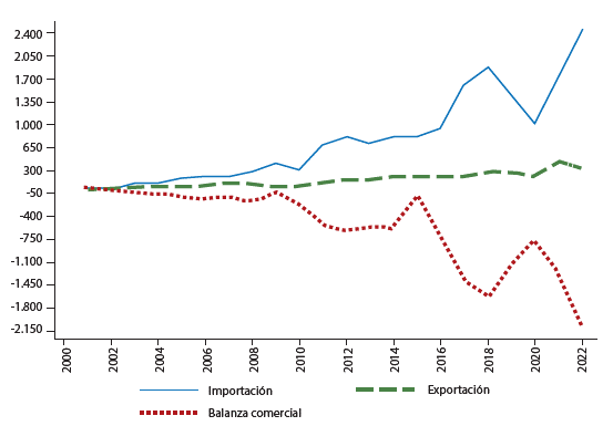 Por otro lado, cuando se analiza la balanza comercial entre ambos países, se observa que existe un saldo a favor de Colombia (figura 4). En este caso, se puede decir que las exportaciones de Turquía a Colombia son considerablemente inferiores a sus importaciones. De hecho, mientras que en 2015 el saldo comercial fue de aproximadamente 615.000 dólares frente a Turquía, en 2019 este valor alcanzó aproximadamente los 1,2 mil millones de dólares. Finalmente, este valor aumentó aún más en 2022 a aproximadamente 2 mil millones de dólares.
