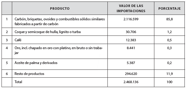 En 2002, los productos importados por Turquía desde Colombia eran menos diversos que aquellos de exportación. Como puede verse en la tabla 3, la principal partida de importación fue el carbón; briquetas, óvalos y combustibles sólidos similares fabricados a partir del carbón, con un 85,8%. El coque y semicoque de hulla, lignito o turba, que también incluye los derivados del carbón, seguido del coque y semicoque de hulla, lignito o turba, con un 1,2%, ocupó el segundo lugar en las partidas de importación. Por su parte, la categoría de "otros productos" solo representó el 11,9% de las importaciones totales. Como se aprecia en la tabla, la diversidad de productos en las importaciones es bastante limitada y el principal producto importado por Ankara desde Bogotá es el carbón y sus derivados.