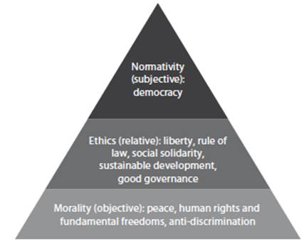 Normativity-deemed to be a container of 'values, principles, rules and standards' (Vasilyan, 2020)-is the skeleton of morality, ethics is its flesh, while without morality they lack a soul. Thereby, the five core norms of the 'normative power' have their seeds in moral theory, yet, they diverge: (Kantian) peace is under the purview of morality (McElroy, 1992), liberty - of ethics (Rothbard, 2015), democracy - of normativity (Frega, 2017), rule of law - of ethics (Leys, 1962), and human rights and fundamental freedoms - of morality (Perry, 2013). As for the four minor norms, social solidarity (Hart, 1967) and anti-discrimination (Williams, 2013) belong to the realm of morality, sustainable development (Langhelle, 1999) and good governance (Congleton, 2020) - to ethics. The establishment of such a normative hierarchy - a lacking prescript in international law giving way to legal argumentation and interpretation (Kratochwil, 2018) is innate to the 'liaisons' of constructivism and critical theory (Price & Reus-Smit, 1998). Such categorisation allows the 'de-construction' of the 'normative power' by 'constructing' a missing 'pyramid' of normative hierarchy via compartmentalisation (Vasilyan, 2020), as presented in the Figure below.