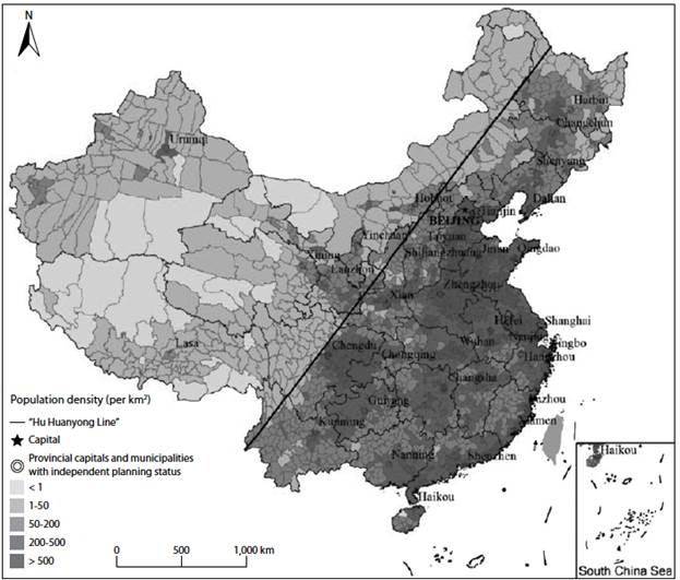 El crecimiento y desarrollo de la economía china también ha afectado a la distribución geográfica de la sociedad como consecuencia de su urbanización. El desarrollo del tejido industrial impulsó el proceso de urbanización de la sociedad con el desplazamiento de gran parte de la población desde el interior del país a las ciudades industriales y portuarias de la costa (Zhibin y Anjiao, 2018). Actualmente, las provincias costeras concentran la mayor parte de la población, lo que ha dado origen a la línea Heihe-Tengchong que divide diagonalmente el país desde la ciudad de Heihe, en el noreste, hasta Tengchong en el suroeste. La mitad oriental concentra aproximadamente el 95% de la población, que se ubica en las provincias próximas al mar en una extensión que representa el 43% del total del territorio chino, mientras que el 5% restante vive en la mitad occidental que representa el 57% del territorio (mapa 2).