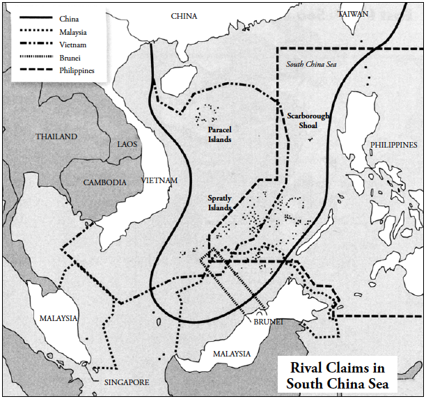 Así, las islas Spratly son reivindicadas unilateralmente por Brunéi, Filipinas, Malasia, Vietnam, la República Popular China (RPC) y Taiwán. En la medida en que no ha podido alcanzarse ningún acuerdo internacional en el marco de la ONU, estas disputas han implicado choques entre los países litigantes, además de la ocupación y militarización de una parte considerable de estas islas. A esto se suma el fallo favorable a Filipinas de una corte de arbitraje internacional en el que se desestimaban los derechos históricos que China reivindica en su disputa territorial con este país (Graham, 2016). Mientras que la situación de las islas Paracelso es ligeramente diferente al tratarse de un archipiélago disputado por Vietnam, la RPC y Taiwán. Actualmente estas islas están ocupadas por la RPC, aunque parte de ellas pertenecieron en el pasado a Vietnam.