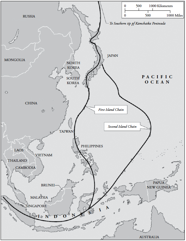La participación de China en la economía mundial y el desarrollo de sus capacidades internas cambiaron la percepción de la realidad de los dirigentes chinos, al mismo tiempo que aparecieron una serie de necesidades de seguridad que exigieron la actualización de la estrategia nacional. El nuevo contexto histórico, internacional y económico contribuyó a la adopción del marco estratégico que el almirante Liu Huaqing había esbozado en la década de los ochenta, y que establece como prioridad la búsqueda del control de los mares cercanos, lo que incluye al mar de China Meridional (Liu, 2004). Esto lo justificó mediante la introducción del concepto de cadena de islas con el que hace referencia a una serie de líneas divisorias concéntricas que atraviesan diferentes archipiélagos en el Pacífico occidental (mapa 5). Estas líneas definen el ámbito de acción geográfico de las fuerzas navales chinas y conforman distintas áreas de defensa. De esta forma, el espacio que comprenden estas cadenas de islas constituye colchones de seguridad para impedir que sirvan como bases de ataque sobre el territorio chino, o bien como puntos de estrangulamiento con los que cortar la cadena de abastecimiento de China (Liang, 2011). Así, la primera cadena de islas comprende el mar de China Meridional, lo que convierte a esta región en un espacio cuyo control es prioritario a nivel inmediato como requisito necesario para que, posteriormente, el Estado chino proyecte su poder sobre la zona de la segunda cadena de islas.