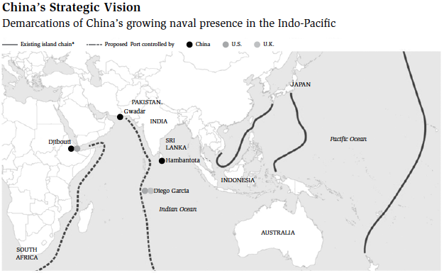 El desarrollo de la economía ha conllevado la ampliación del alcance geográfico del interés nacional chino al expandirse más allá de sus fronteras y aumentar la influencia tanto sobre sus vecinos como sobre el resto del mundo. La nueva situación, junto a la ubicación geográfica de China, ha aumentado la dependencia de este país de las rutas comerciales marítimas que atraviesan el Índico y el mar de China Meridional, las cuales han adquirido una importancia estratégica para la seguridad nacional y la política exterior chinas. Estas rutas desempeñan un papel crucial para el sostenimiento y desarrollo de la economía china y, por extensión, para su creciente poder militar a fin de proteger sus líneas de abastecimiento y alcanzar en el futuro el estatus de gran potencia.