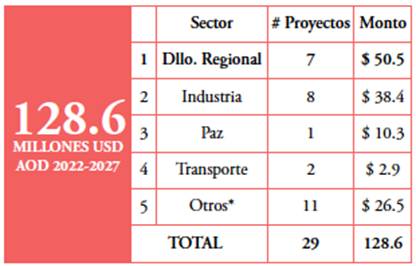 Conforme a los datos del Sistema de Información de Cooperación Internacional de la Agencia Presidencial de Cooperación Internacional de Colombia, APC-Colombia, entre 2017 y 2023, la cooperación oficial de Corea en Colombia se materializó en 35 proyectos de AOD por un monto de USD 119 millones (Agencia Presidencial de Cooperación Internacional de Colombia, 2024a).