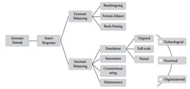 Systemic pressure will prompt states to achieve equilibrium. External balancing entails the formation of alliances with reliable partners, the transfer of responsibility to other parties, or the adoption of a partisan stance. With regard to internal balancing, the existing literature is less developed, and it encompasses the building of capabilities, the extraction and mobilization of resources, the formulation of a strategy, the establishment of an organizational structure, and the development of a doctrine. This may be achieved through the implementation of countermeasures, emulation, or innovation. It is typically only great powers that innovate, as they possess an additional margin of safety and resources that can be allocated to risk-taking projects.1
