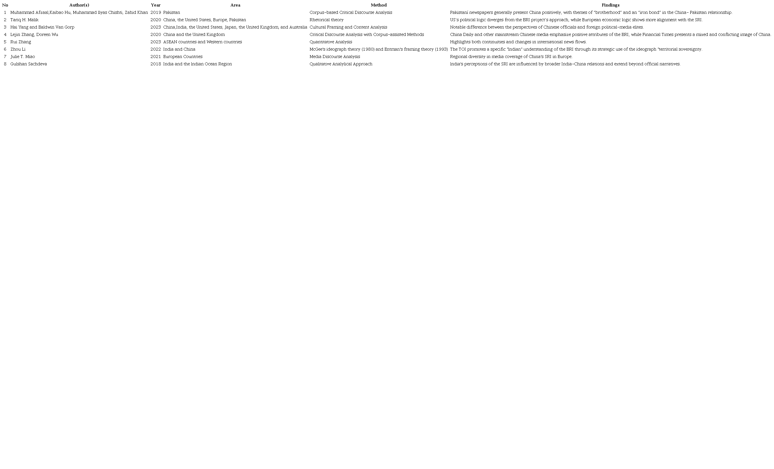 In her article published in 2022, Zhou Li focuses on how the Times of India presents China's BRI. In her analysis, Li draws upon the 1980 concept of ideographs as presented by McGee and the framing theory put forth by Entman in 1993. She employs these concepts to examine how a significant media platform, the Times of India (TOI), shapes public opinion on international and domestic issues through its reporting. The study focuses on the application of a specific ideograph, "territorial sovereignty," in the context of Times of India's coverage, which represents a distinctly Indian perspective on the BRI. Furthermore, the research presents a historical overview of the principles and implications associated with the concept of "territorial sovereignty" as an ideograph, thereby establishing a robust foundation for a more comprehensive examination of its interpretation within the context of TOI. Li provides a compréhensive examination of 40 TOI articles, employing a synchronic structure to elucidate the ideograph's interconnections and surrounding narratives. This approach demonstrates how elite media outlets employ strategic language and framing to influence public understanding of significant international issues such as the BRI, illustrating the nexus between media and politics in the field of international relations. In her 2021 study, Julie T. Miao examines how European countries perceive China's growing global influence, particularly in the context of their Belt and Road Initiative (BRI) programs. This report employs a media discourse analysis to identify the variability in local reporting of BRI. This diversity can be attributed to the varying roles that countries assume in discourse: they may act as discourse leaders, responders, or followers. It is evident that there are considerable discrepancies in the perceptions of European countries regarding the potential impact of BRI and China's involvement on global political affairs. It is notable that the leaders of the European Union have undergone a shift in perspective, moving from an optimistic stance to a more conservative one. The lack of clarity surrounding China's use of soft power to promote the BRI in Europe may be a significant factor contributing to the program's limited success, as proposed in this article.