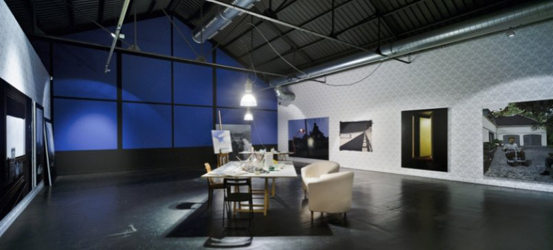 Charris y Sicre descubren en 1997 la obra de Leon Spilliaert (Bélgica, 1881-1946), un oscuro pintor belga apenas un año mayor que Hopper, pero aún tardarán diez años en tomarlo como guía para viajar a Ostende, en el Mar del Norte. De nuevo, una pequeña ciudad costera cobija a un pintor local con una visión muy personal de lo que le rodea. Charris y Sicre viajaron durante varios años a Ostende para pasear por sus calles y museos, y preparar los grandes cuadros nocturnos que presentaron en su exposición conjunta en La Conservera (Ceutí, Murcia) (ver imagen 9). El montaje corrió a cargo del arquitecto Martín Lejarraga, quien dividió la exposición en dos grandes zonas, una playa nocturna con arena y sillas de playa, y el estudio del artista, un interior empapelado y amueblado con un caballete, mesas de trabajo y un expositor con bocetos y apuntes en el piso superior, desde donde se podían ver las dos zonas expositivas. En las paredes de este doble ambiente oscuro se apoyaban una veintena de cuadros de gran formato, bocetos y pequeños apuntes agrupados en nubes, como ventanas que nos introducían en la ciudad monocroma de Spilliaert. Esos paisajes no son documentales sino alegóricos, y su ambiente y sus referencias se matizan gracias a los tres textos del catálogo,3 que proponen de nuevo una conversación entre amigos donde se discute qué fueron a buscar, quién es Spilliaert y qué se traen de vuelta.