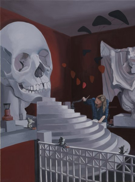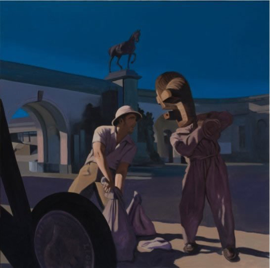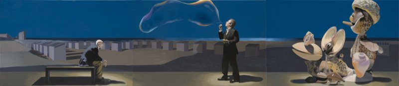El tercer texto, Bonsoir, monsieur Spilliaert de Fernando Huici March, es esencial para comprender cómo se posan esas sombras en las imágenes. Huici acompañó a Sicre y Charris en su primer viaje, en 2007, y nos describe la espontaneidad de esos paseos, lo que les condujo a situaciones frustrantes, como el encontrarse con museos cerrados por reformas, pero también permitió la aparición de sorpresas fuera de programa, como tener el tiempo suficiente de aburrirse tanto como para que la playa fuera calando en su imaginario, hasta convertirse en un lugar central. Huici compara este proyecto con el primer viaje en busca de Hopper, y todo lo que ha cambiado en veinte años. En 1997 la obra de ambos pintores no estaba aún tan madura, y la huella de Hopper se reflejó sobre todo en los aspectos técnicos, como la recreación de su atmósfera. En este segundo viaje se acumulan años de experiencia y viajes, ya que Charris y Sicre han continuado viajando por separado a la India y a África. Ahora los fantasmas son más evidentes, y aunque la atmósfera empolvada de Spilliaert, nocturna y sinuosa, marca esas pinturas, lo que vemos son anécdotas biográficas reinterpretadas por cada pintor en el Ostende actual. Huici analiza una decena de cuadros de Charris y Sicre, sin agotarlos, sino señalando más bien pequeñas conexiones entre las imágenes enigmáticas que tenemos delante y la obra de Spilliaert. Ecos, como las formas sinuosas de una gran pompa de jabón en Supercalifragimetafísico de Charris (ver imagen 10), tan curvada como las orillas modernistas de los paisajes acuáticos de Spilliaert. Anécdotas apócrifas, como el encuentro entre Stalin y Spilliaert en Suiza, en Los escapistas (ver imagen 11). Frustraciones documentadas, como el viaje aplazado de Spilliaert al Congo en Los fantasmas de Ostende (ver imagen 12),una aventura exótica que nunca tuvo lugar más allá de los sueños. Huici revela conexiones difíciles de comprender para el espectador que entrara inadvertido en la sala, como la referencia elíptica al cartel publicitario que Spilliaert diseñó para anunciar “La Brisa de Ostende”, una nueva colonia de la perfumería de sus padres, y que Charris utiliza para mover las velas de un barco en Paintingland (ver imagen 13). O los colores del estudio de restauración presidido por una enorme calavera, un eco de la calavera que tenía Spilliaert en su estudio sobre una caja de madera lacada, en Posteridad (ver imagen 14). Los cuadros de Sicre y Charris aparecen mezclado sin divisiones marcadas, pero si en el proyecto sobre Hopper se confundían, ahora se distinguen claramente. Los cuadros de Sicre tienen una factura calculada y fría, muy contenida. Recrea delicadamente habitaciones y paisajes quietos, controlando esos ambientes oscuros de cielos grises y paseos nocturnos. El humor y la fantasía quedan del lado de Charris, mientras Sicre intercala esquinas anodinas que anclan el viaje a su localización fotográfica.