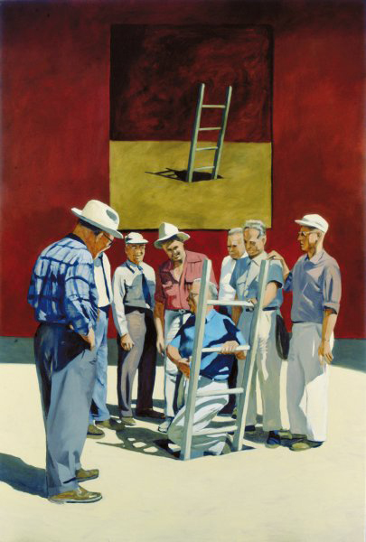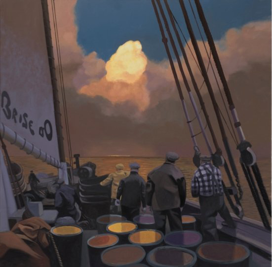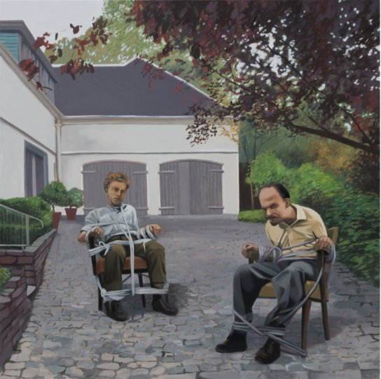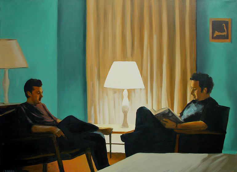 Este carácter de diálogo abierto destaca en los dos proyectos que voy a revisar a continuación. Ángel Mateo Charris no solo se asocia con Gonzalo Sicre (Cádiz, 1967), sino que invitan a media docena de historiadores y críticos a colaborar en la conversación. Solos, en pareja o acompañados por amigos, Charris y Sicre viajan a dos pequeñas ciudades costeras de veraneo, Truro y Ostende, que reflejan como un espejo algo distorsionado la ciudad mediterránea de Cartagena en donde residen. Visitan la vivienda, los paisajes y la atmósfera de dos artistas de comienzos del siglo XX, Hopper y Spilliaert, pintores figurativos algo relegados por los discursos vanguardistas, en busca de cómo reflejan otra modernidad. Sicre y Charris pintan lo que encuentran, lo que proyectan y lo que sospechan, para preparar una exposición y un cuidado catálogo. Cada pintor trabaja en su línea, y luego instalan las imágenes mezcladas. Y aunque tienen muchos puntos en común, cada vez se acentúan más sus diferencias. La obra pictórica de Sicre es oscura y delicada, reproduce atmósferas cinematográficas melancólicas, generalmente sin personas, con un color apagado, casi frío. En esos paisajes e interiores crepusculares hay silencio, no humor. Su imaginación es fotográfica, sin fantasía. Sicre es la calma.