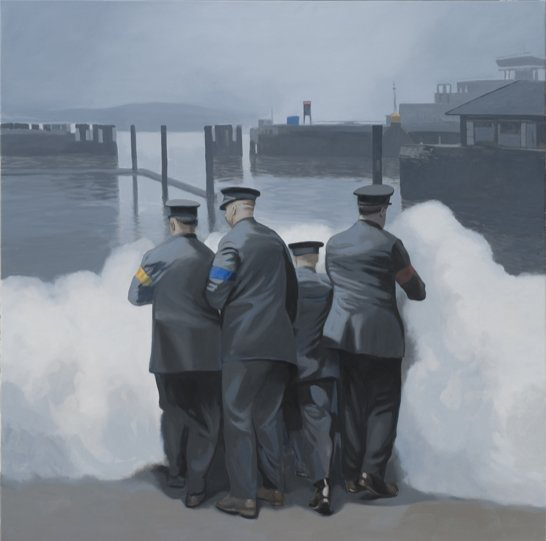 Las sillas que hay en la exposición nos invitan a mirar esos grandes cuadros con calma, mientras leemos los textos, tomándonos todo el tiempo que queramos para encontrar o imaginar sus conexiones. Entre ellas todavía se cuelan un par de ambientes hopperianos, El parque y Ostende, escenarios vacíos de gente, mezclados con obsesiones personales que terminan enriqueciendo las referencias demasiado directas al mundo de Spilliaert, como un paisaje porturario en la niebla (Brouillard) (ver imagen 15), que hace referencia a la película de Resnais Noche y niebla, y recrea parte del legado más oscuro de esas tierras, vivo en el momento de la muerte de Spilliaert. La labor crítica de ambos pintores, uno abocado a la imaginación y otro recordando el aspecto fotográfico de la ciudad, contrapone dos enfoques de la representación de lo real, y funciona por acumulación, leyendo, mirando, dejando reposar la mezcla, y volviendo a mirar.