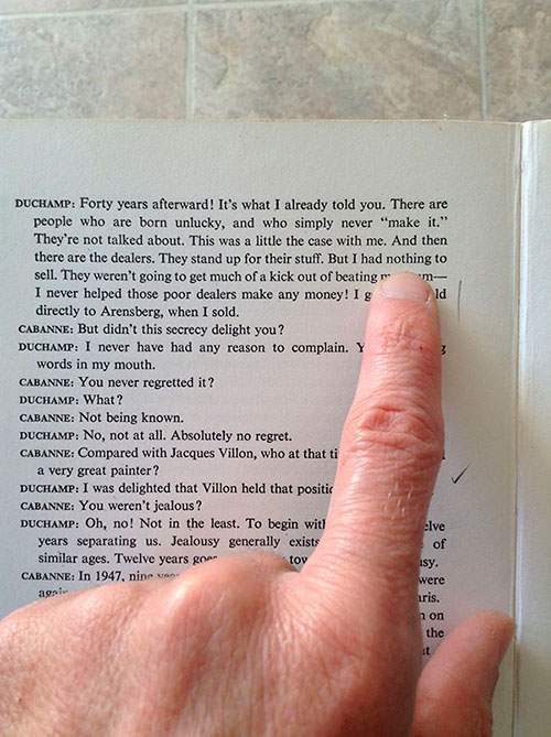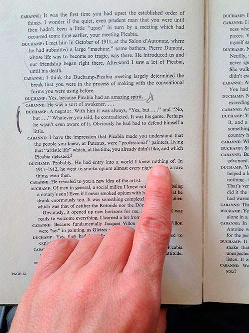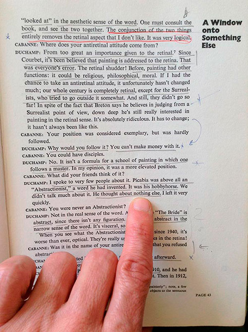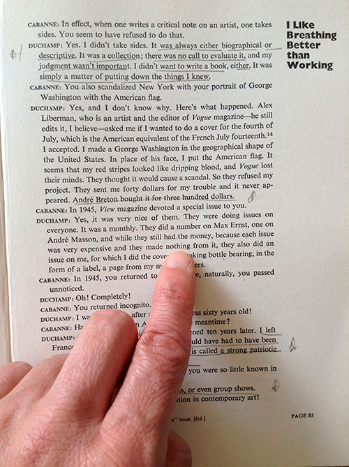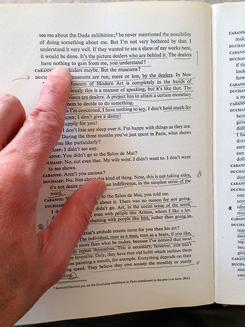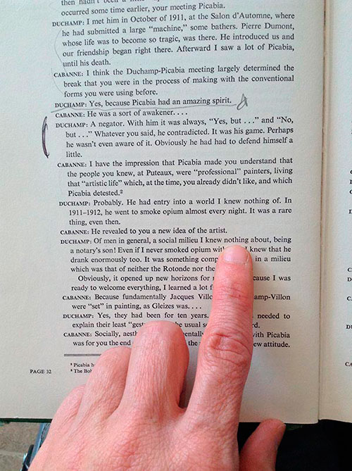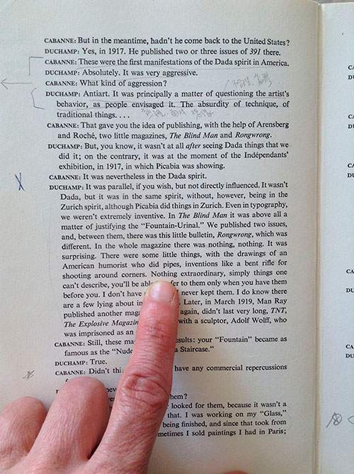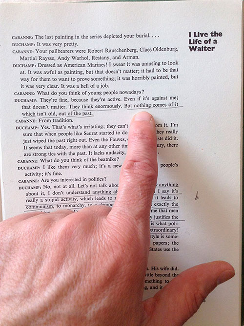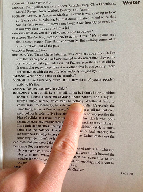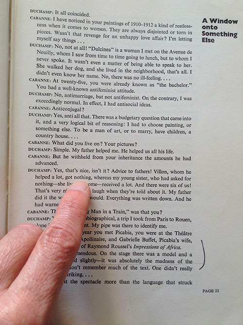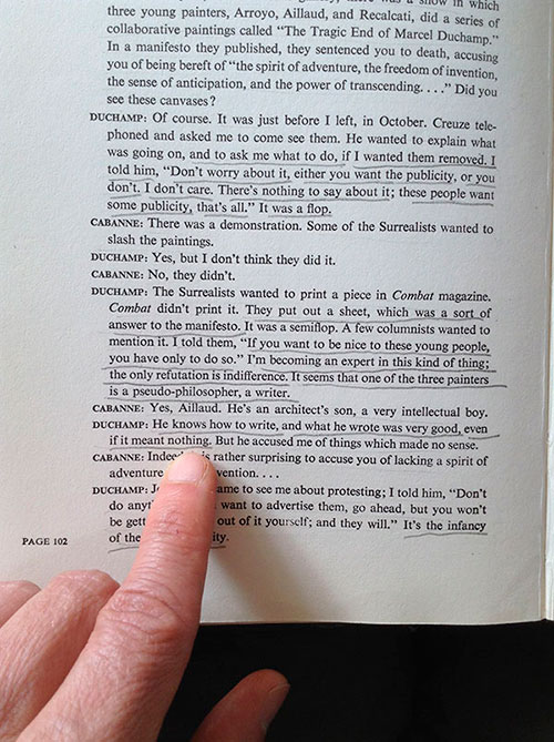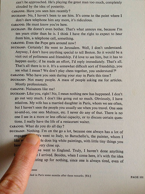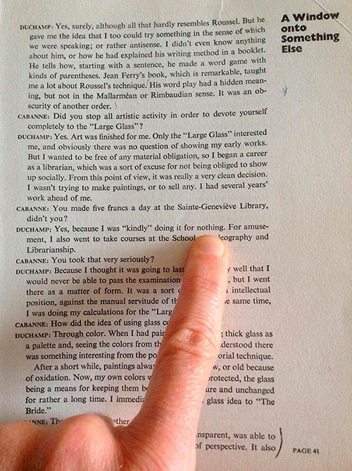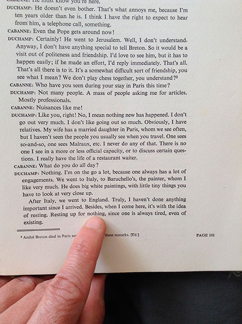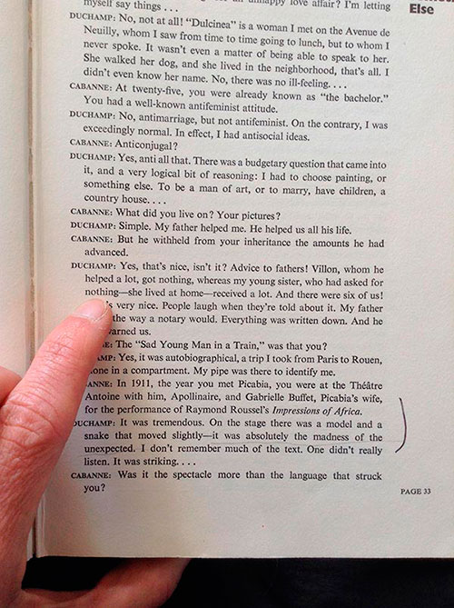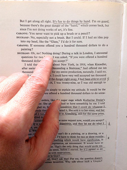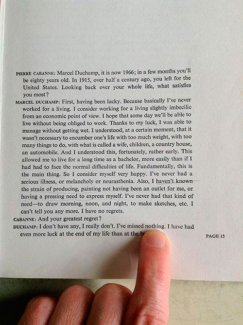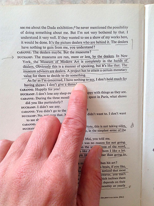 Este proyecto, consiste en la selección de todas las veces en las cuales Marcel Duchamp respondió, o incluyó, la palabra nothing —nada— en su famosa entrevista con Pierre Cabanne en 1966, pocos días antes de cumplir 80 años y dos años antes de su muerte. El trabajo está realizado como un ejercicio de lectura e investigación y a la vez como ejercicio de apropiación de la página escrita a través del registro fotográfico. Los cortes permiten un acercamiento al texto de manera fragmentaria, rompiendo la linealidad de la narrativa y sugiriendo nuevas interpretaciones. Marcel Duchamp emplea 36 veces la palabra nothing en la entrevista. El libro de donde tomo las imágenes es Dialogues with Marcel Duchamp, de Pierr Cabanne. New York: The Viking Press, la edición es de 1971.