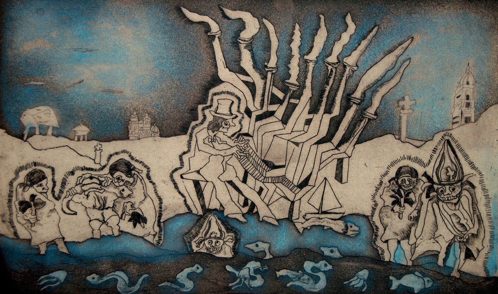 Aguafuerte y guatinta iluminado a mano. Papel Arches, 50-x-65.5 cm. Panamá.Julio Zachrisson (2020).