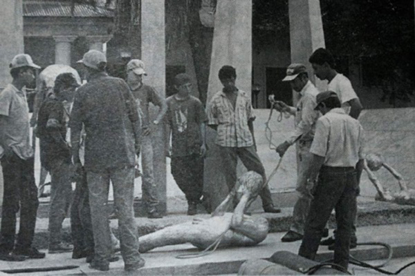Lozano, D. (2018). Registro fotográfico de la demolición de la escultura pública, “Triada escultórica y un sabio” de Regina Aguilar. El Heraldo de San Salvador. https://www.elheraldo.hn/entretenimiento/regina-aguilar-y-el-casto-enfado-del-edil-sampedrano-GCEH1175056