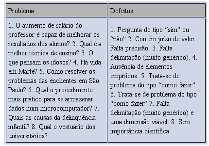 Segundo Vergara (2004), Perneger e Hudelson (2004), Lakatos e Marconi (2010) e Gil (2010), o problema (pergunta) de pesquisa deveria ser: (a) formulado como pergunta aberta: não deve permitir respostas do tipo “sim” ou “não”, pois elas não instigam a realizar testes; (b) claro, objetivo e preciso: os conceitos e termos usados em sua enunciação não devem ser ambíguos nem gerar dúvidas; (c) empírico (científico): pode ser eficazmente resolvido por meio de pesquisa, ou seja, é observável e testável na realidade por meio de técnicas e métodos apropriados. Vale ressaltar que, para ser científico, o problema não deve envolver juízo de valor (fruto de opinião) nem focalizar em como fazer algo de forma eficiente; (d) suscetível de solução: isto é, as variáveis do problema devem permitir observação ou manipulação, assim como levar a uma conclusão válida; (e) viável para pesquisa: isto é, existem recursos para pesquisar, principalmente, em termos de tempo e custo; (f) capaz de trazer conhecimentos novos; e (g) relevante para uma ampla parcela da comunidade científica. O Quadro 1 apresenta exemplos de problemas inadequados para pesquisa com os respectivos defeitos.