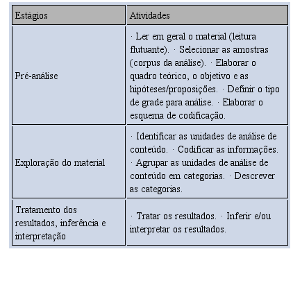 Em seguida, definiu-se a grade do tipo mista para a análise de conteúdo. O termo grade significa o tipo de abordagem a ser utilizada para identificação das categorias. A grade mista conjuga as lógicas dedutiva e indutiva, identificando as categorias a priori, porém podendo-se incluir, excluir ou modificar categorias a posteriori, à medida que a exploração do material ocorra. Por exemplo, neste estudo, houve três conjuntos de categorias: finais, intermediárias e iniciais. As categorias finais e parte das categorias iniciais foram definidas a priori, porém as categorias intermediárias foram definidas a posteriori.