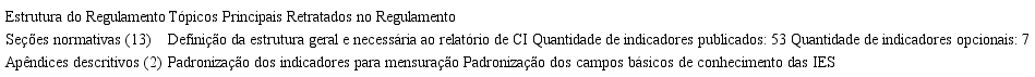 No parágrafo quarto são apresentados os indicadores básicos que precisam ser divulgados na forma narrativa e devem descrever as estratégias da IES relativa a diversos aspectos, tais como: (i) garantias de qualidade; (ii) domínio de relações públicas; (iii) medidas para alcançar a missão da universidade; (iv) medidas de igualdade de gênero; (v) medidas para desenvolvimento do pessoal e treinamento de funcionários; (vi) medidas que atendam aos estudantes com deficiências; e (vii) medidas relacionadas a grupos de pesquisa.