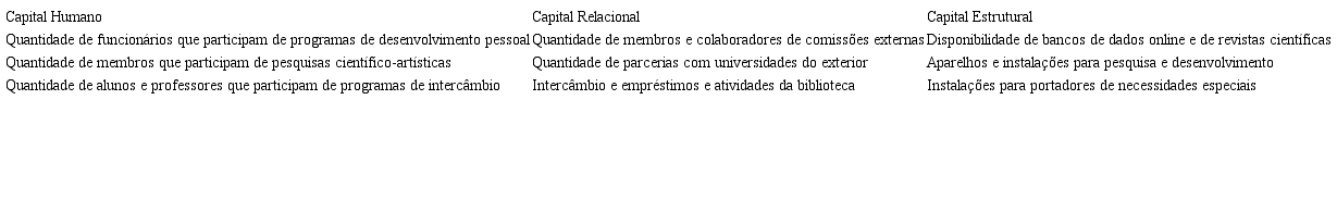 Cada uma das três dimensões de CI (Capital Humano, Relacional e Estrutural) também são descritas, com respectivos indicadores, exemplificados no Quadro 2.