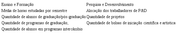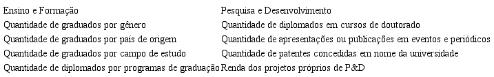 Cabe destacar que também há dois grupos de indicadores destinados a cursos específicos, os quais não serão analisados neste estudo, trata-se de um grupo de indicadores destinado às universidades que ofertam cursos de medicina e outro grupo às universidades de artes.