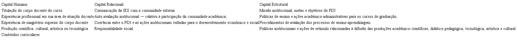 Conforme já mencionado, diferentemente do modelo austríaco, o SINAES, a princípio, não foi elaborado para a divulgação do CI, porém contém elementos de CI. Portanto, para os propósitos da presente pesquisa, foi empreendida uma categorização de indicadores presentes nos instrumentos de avaliação institucional e de cursos. Assim, dos 88 indicadores considerados, 64 estão relacionados à CI e os 24 restantes a itens presentes na contabilidade tradicional. De modo específico, foram identificados, por análise de conteúdo temática e contagem, 22 indicadores relacionados à dimensão Capital Humano, 30 de Capital Estrutural e apenas 12 de Capital Relacional. A título de exemplificação, o Quadro 5 cita alguns indicadores relativos às três dimensões de CI presentes implicitamente no modelo brasileiro.