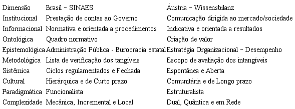 Nesse contexto, o presente estudo objetivou analisar, sob o aspecto de divulgação do Capital Intelectual, os modelos de avaliação de IES adotados no Brasil e na Áustria, visando explorar e evidenciar similaridades e diferenças. O modelo brasileiro não foi formulado com a finalidade específica de divulgação do CI, porém enfoca alguns desses recursos. Por outro lado, em outra posição em prol da evidenciação e divulgação do CI, desde 2007 as universidades austríacas são obrigadas por lei a publicarem informações sobre CI — tendo sido, portanto, um modelo elaborado para esse fim (CÓRCOLES; PEÑALVER; PONCE, 2011).