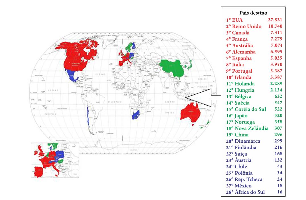 Dados extraídos da Figura 2 apontam para expressiva concentração no envio de bolsistas para as universidades situadas nos Estados Unidos (27.821) e no Reino Unido (10.740). O fato de grande parte dos países que atraíram os maiores contingentes de bolsistas serem anglofalantes e integrarem o grupo formado pelos países centrais reforça o argumento de que “a internacionalização tem como corolário o aumento do poder da polarização da produção de conhecimento por parte dos países do centro do sistema-mundo” (RODRIGUES; CARRIERI, 2001, p. 93). Contudo, entre os países que acolheram bolsistas do PCsF, encontram-se também a China (na 19º posição, com 296 bolsistas) – que de acordo com o governo brasileiro, em 2017 foi o maior importador do Brasil –, bem como o Chile (na 24ª posição) e o México (na 27ª), países vizinhos que se destacam no processo de internacionalização na região.