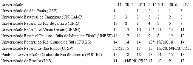 THE. World Uiversity Rankings 2016-2017. 2017. Disponível em: . Acesso em: 25 ago. 2018.