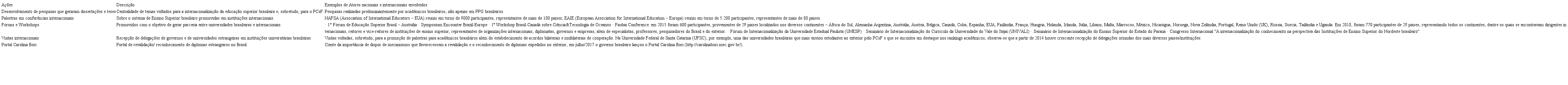 Os resultados positivos associados ao PCsF não se reduzem à classificação das universidades brasileiras nos rankings regionais e globais. A interpretação da literatura e dos documentos consultados permitem ampliar as referidas conquistas, como se observa na Tabela 4. A magnitude do programa coloca o Brasil, particularmente as universidades brasileiras, em evidência. Indícios disso são o expressivo número de dissertações e teses que discutem a internacionalização da educação superior brasileira e a criação de grupos de pesquisa voltados ao entendimento desse fenômeno; a promoção de fóruns, workshops e palestras nacionais e internacionais cujo objetivo residia em compreender o PCsF, a universidade e o sistema de ensino superior brasileiro; a presença de delegações internacionais no Brasil; a promoção de visitas de gestores universitários brasileiros a universidades estrangeiras e sua presença nas principais feiras mundiais de educação superior internacional; a criação e lançamento do portal de revalidação/reconhecimento de diplomas estrangeiro (Carolina Bori), bem como o Programa Institucional de Internacionalização (PrInt), que será abordado mais adiante.