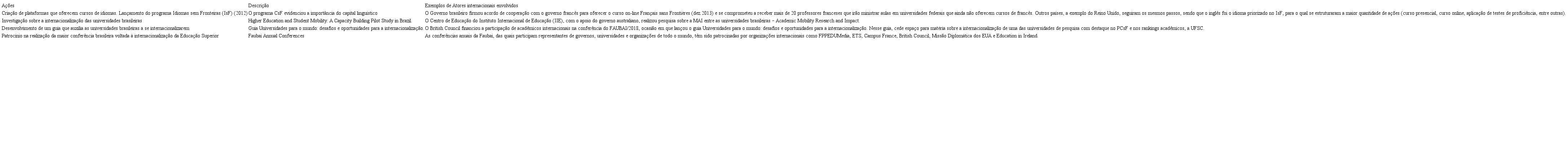Determinado a promover a internacionalização das universidades e obter resultados de curto e médio prazo, o governo brasileiro fortalece o PCsF (AVEIRO, 2014; MULLER, 2013) e o montante de recurso implicado desperta o interesse de governos e universidades internacionais. Nesse contexto, crescem as iniciativas voltadas para a compreensão do sistema de ensino superior, particularmente das universidades brasileiras, que possam favorecer a formalização de parcerias voltadas para a promoção do ensino de idiomas nas universidades públicas, o financiamento de estudos sobre o sistema de educação superior, o financiamento de publicações e guias capazes de auxiliar as universidades no “necessário” processo de internacionalização, entre outras, como se observa na Tabela 5.