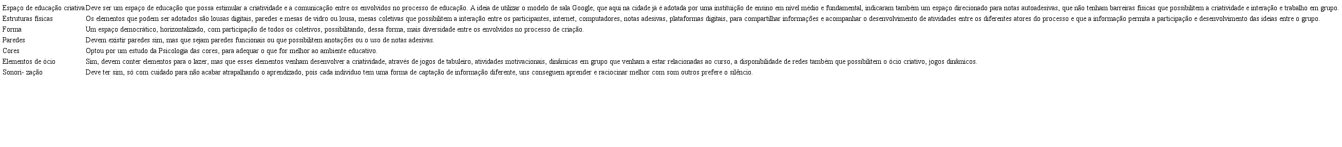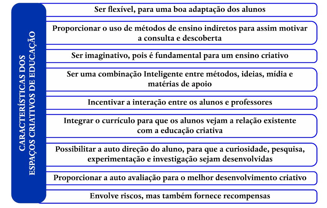 Aspectos relacionados a espaços criativos de educação têm sido apontados na literatura, por exemplo: flexibilidade, interação (ROMERO, 2013); equilíbrio entre liberdade e estrutura (NICKERSON, ١٩٩٩; ALONSO MONREAL, ٢٠٠٠); estruturas socializantes (AMABILE, ١٩٩٦); estruturas ricas de estímulos (TORRE, ٢٠٠٦); estruturas físicas mais dinâmicas, interativas e colaborativas para o aprendizado (SILVA; SILVA; COELHO, ٢٠١٦; SILVA et al., 2018); bem como comporta atividades multidisciplinares, de ensino-equipe, sensações estimuladoras e participativas em sala de aula, permite trocar experiências, diálogo, possibilita conforto, sensação de segurança e tranquilidade (SILVA; SANTOS, ٢٠١٥).