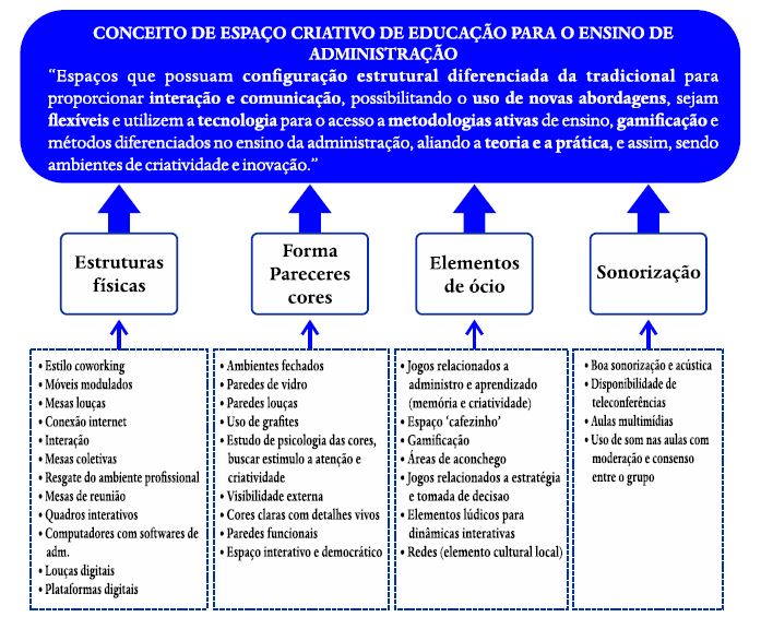 A partir da sobreposição de ideias, o conceito de espaço criativo de educação no ensino da Administração pode ser definido como: espaços que possuam configuração estrutural diferenciada da tradicional para proporcionar interação e comunicação, possibilitando o uso de novas abordagens; sejam flexíveis e utilizem a tecnologia para o acesso a metodologias ativas de ensino; gamificação e métodos diferenciados no ensino da Administração, aliando a teoria e a prática; e, assim, sendo ambientes de criatividade e inovação. Enquanto os elementos deste espaço estão sintetizados na Figura ٢.