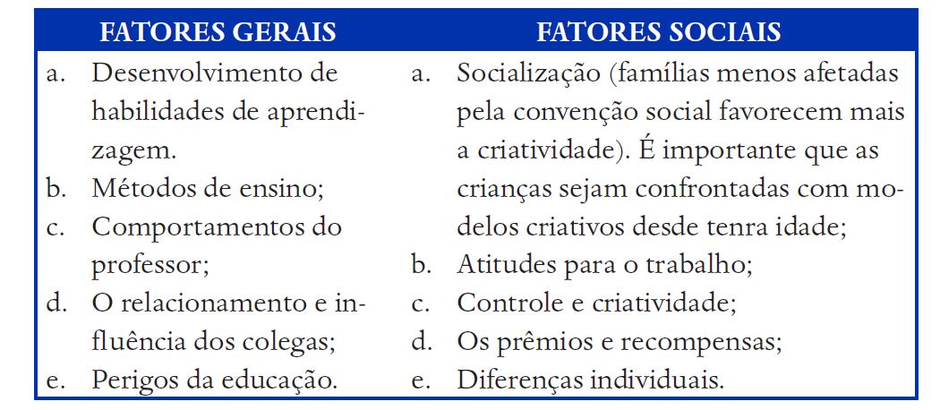 Por outro lado, Amabile (1996) opera no âmbito da chamada abordagem ambientalista à criatividade, para o qual este autor aponta dois fatores que estão envolvidos para a melhoria da criatividade na educação: os fatores gerais e os fatores sociais (Quadro 1). Nessa perspectiva, o ambiente para a educação criativa vai além do espaço físico, alcançando métodos e comportamentos.