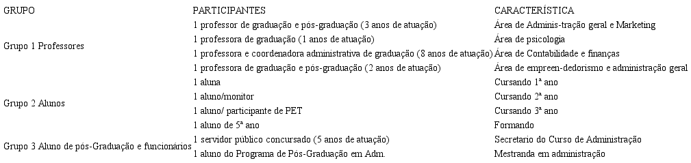 Na escolha dos participantes da pesquisa, para melhorar a confiabilidade dos resultados, foram definidos parâmetros para a amostragem intencional, a saber: (1) os alunos deveriam ser de diferentes níveis no curso; (2) deveria ser incluído pelo menos um aluno de nível de pós-graduação em administração; (٣) os professores deveriam ser de diferentes áreas/disciplinas e (٤) um dos professores deveria ser representante da coordenação acadêmica.