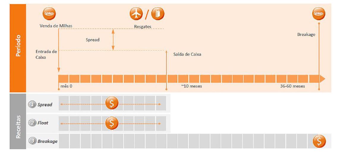 O modelo de negócio da Smiles tem três fontes de receita importantes, que são (1) Spread, (2) Float e (3) Breakage, sendo que cada uma delas possui um período médio diferente, entre entradas e saídas, para permanecer no caixa da empresa, como poderá ser observador na Figura 10.