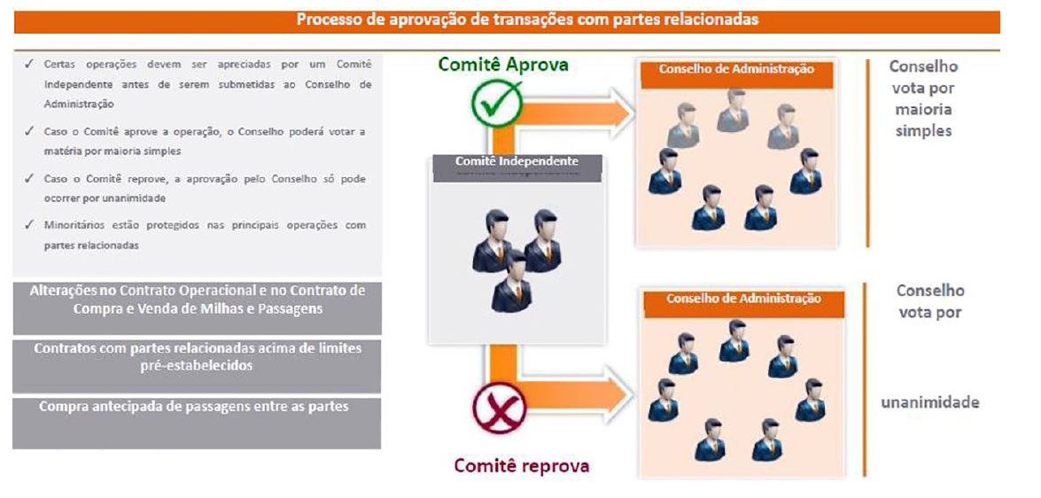 Um aspecto interessante a ser destacado é a relação de governança existente entre a Smiles e a Gol, tendo sido um ponto positivo que fora ressaltado pelos investidores. Apesar de serem empresas com o mesmo controlador, atuam de forma independente, sendo, concomitantemente, fornecedoras e clientes de ambas. De um lado, a Smiles é gestora do programa de fidelidade da Gol, que adquire as milhas do Smiles para créditos originários dos voos realizados pelos clientes da Gol e, de outro, a Gol é fornecedora da Smiles, que compra assentos na companhia aérea para emissão de bilhetes por meio de sua plataforma. Miguel et al (2014) estudaram a criação de valor entre firmas da e observaram que a criação de valor só é significativa quando há governança relacional e complementaridade de recursos. Para estabelecer essa governança, há um rígido contrato entre a Smiles e a Gol que exige um comitê independente para a aprovação de determinadas operações antes de serem submetidas ao Conselho de Administração da empresa. Se este comitê independente aprovar a operação, o Conselho de Administração poderá votar a matéria por maioria simples. Porém, se este comitê independente reprovar a operação, o Conselho de Administração somente poderá aprová-la por unanimidade. Desta forma, os investidores minoritários estão protegidos nas principais operações com as partes relacionadas, como poderá ser observado na Figura 11.