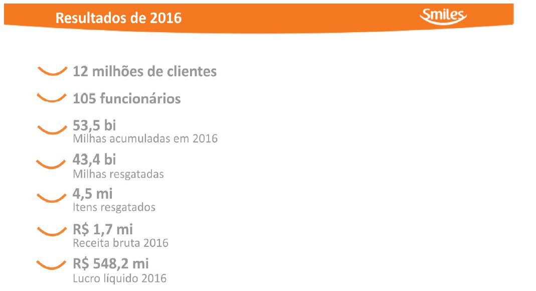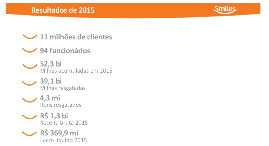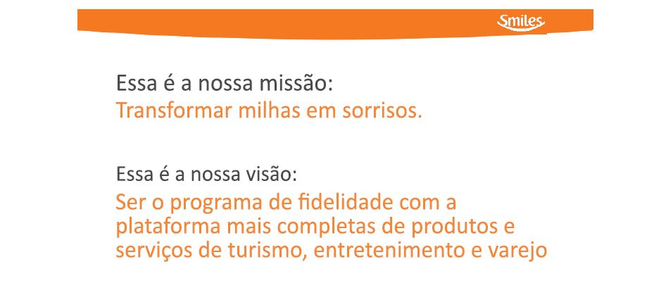 Além disso, é perceptível a ampliação de foco da companhia em outros produtos, além do tradicional acúmulo e resgate de milhas em companhias aéreas, tais como aumento de campanhas promocionais em parceria com o Shopping Smiles, valendo-se de seus parceiros no segmento de bens para o varejo e com a Rocketmiles, sua parceira no segmento de hospedagens.