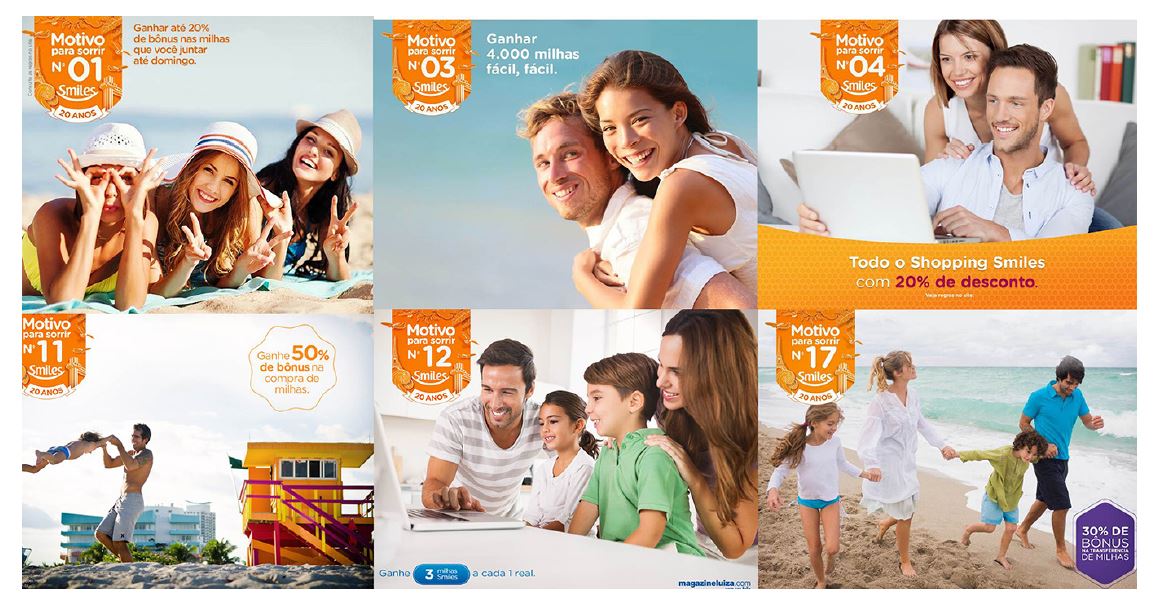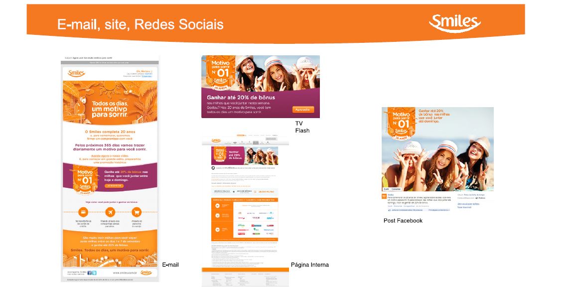 Mas o ápice desse ano seria a comemoração dos 20 anos do Smiles, ou seja, uma companhia com 20 anos de existência, com uma base de 10 milhões de clientes e que começava a dar seus primeiros passos, novamente, em relação a esse novo e promissor modelo de negócio. Para esta comemoração, foi criada a plataforma de comunicação “365 Motivos pra Sorrir”, que surgiu da seguinte forma, como relatou a Head of Marketing da empresa, Bruna Milet: “[...] a ideia surgiu na fala do presidente Leonel, numa reunião que tivemos na agência, que ele dizia que queria o Smiles todo dia presente na vida das pessoas. E a partir disso a gente começou a pesquisar e notamos que o Smiles tinha muita promoção constante, praticamente todos os dias, então, já tínhamos essa cultura, só que não era reportado dessa maneira. Então foi assim, nós contamos e percebemos que praticamente tinha uma por dia e, com isso, passamos a dizer que íamos ter uma por dia, e buscamos uma visão de varejo, com a ideia de que todo dia tem algo para oferecer ao cliente. E foi criada uma cultura de que tem muita coisa acontecendo no Smiles, e a campanha ajudou a frisar isso na mente dos clientes e isso gera lembrança, gera consideração e nós não esperávamos que os clientes decorassem as promoções todos os dias, mas que ele passasse a considerar sempre a gente”.
