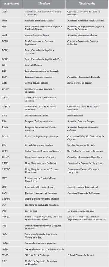 Palabras clave: centros de innovación, digitalización, disrupción financiera, facilitadores de innovación, fintech, inclusión financiera, innovación financiera, mercados financieros, política regulatoria, sandbox regulatorio.