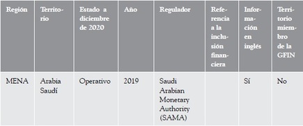 Saudi Central Bank (SAMA). (s.f.). Regulatory Sandbox Framework [base de datos]. Arabia Saudí. https://www.sama.gov.sa/en-US/Regulatory%20Sandbox/Pages/Regulatory-Sandbox-Framework.aspx (consultado en enero de 2021).