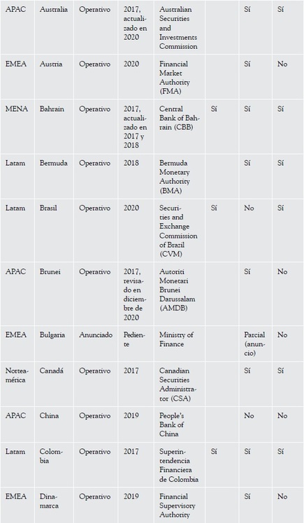 Para ello, se han analizado las iniciativas de políticas públicas de innovación financiera (facilitadores de innovación) hasta diciembre de 2020 a nivel mundial, ya sea que estén operativas o en proceso de implantación, a través de la documentación disponible en sus páginas web, examinando un total de 61 jurisdicciones que reúnen un total de 68 iniciativas. De estas, 56 se encuentran operativas y 12 ya han sido anunciadas o están en desarrollo.